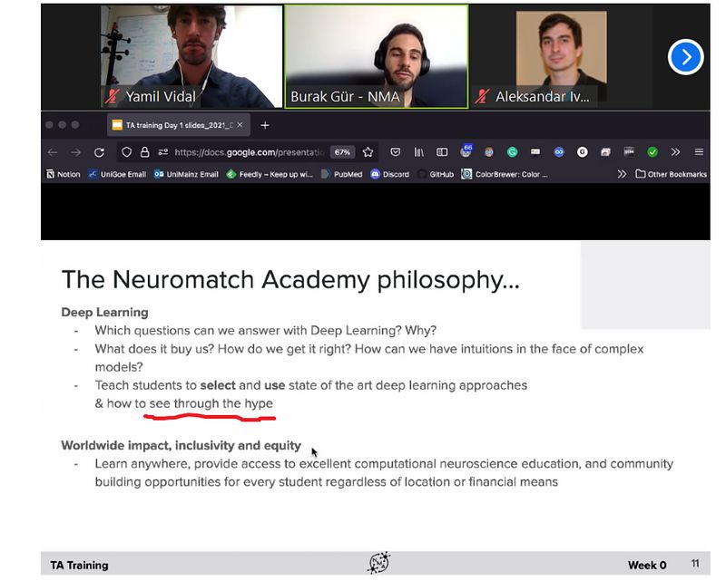 I am part of the organization team of Neuromatch Academy courses for comp. neuro and machine learning. At NMA 2023 I was the executive chair leading the Instruction department and dealt with Teaching Assistant (TA) related issues such as TA selections, training, support before and during the course. In 2025, I co-chaired the Instruction department for the first months of the year.